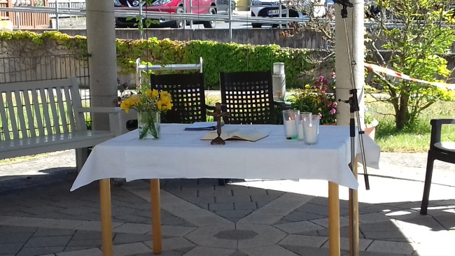 Die evangelische Diakonin Claudia Grunwald und der katholische Ortspfarrer Robert Borawski feierten im Garten des Seniorenheims einen ökumenischen Gottesdienst. Dafür hatte das Team des Hauses einen Altar im Pavillon aufgebaut.