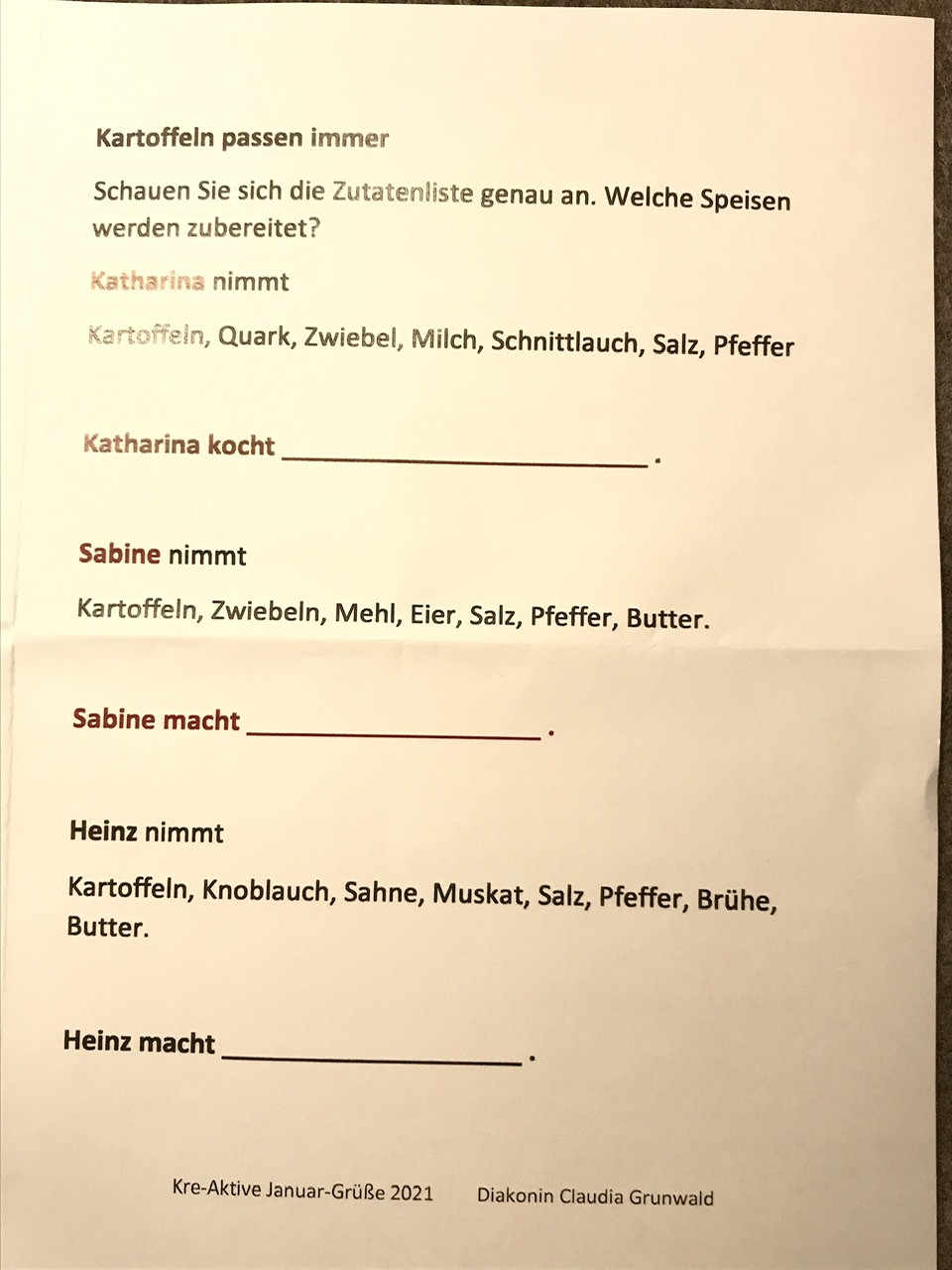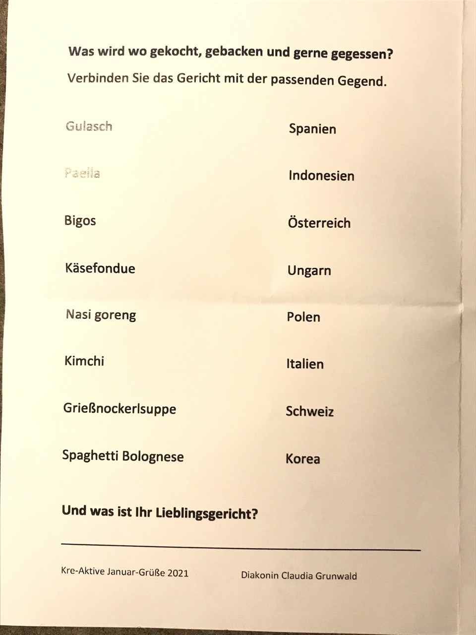 Die erste Seite bietet wieder die Möglichkeit sich mit Farbstiften zu bewaffnen und kreativ bunt ins Jahr 2021 zu starten. Vielleicht gelingt es ja, hier auf unserer Homepage einige Werke zu zeigen - geben Sie es einfach im Pfarrbüro ab. Die folgenden Seiten der Kre-Aktiven Grüße beschäftigen sich hauptsächlich mit allerhand Leckereien, die wir uns selbst zubereiten müssen, da die Restaurants bis auf weiteres geschlossen bleiben. (außer man holt sich etwas ab). Auf Seite 3 merkt man schnell, dass mit fast gleichen Zutaten sehr unterschiedliche Gerichte entstehen können. Man kann gespannt sein, ob jeder hierbei an das gleiche Gericht denkt.