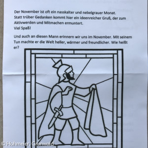 Auf der ersten Seite regt das Bild zum Ausmalen an. Es ist unschwer zu erkennen, dass es sich hier um St. Martin handelt. Doch wer war dieser Martin, wann hat er gelebt, was hat ein Soldat auf dem Deckblatt zu suchen?