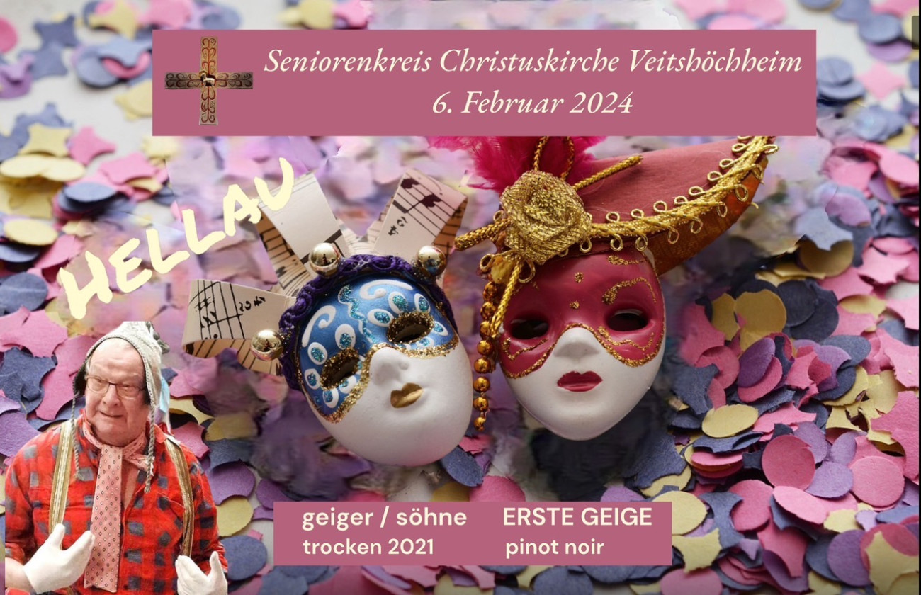 bekam Rudi als Dankeschön einen Faschingsorden vom Seniorenkreis der Christuskirche und einen guten Tropfen als „fränkischer Währung“ mit einem gestalteten Faschingsetikett. Auch die Helfer und Organisatoren des Seniorenkreises bekamen einen Faschingsorden, als Dank für all die Mühen und die stets schöne Gestaltung. Da ließ Rudi es sich nicht nehmen und gab sogleich noch eine Zugabe mit der Nummer „Ach wenn ich doch ein Pfarrer wäre“, die er bereits am 11.11.23 zum Faschingsingsgottesdienst in der Vituskirche zum Besten gab. Leider hatte Rudi noch Anschlusstermine, sodass er nicht bis zum Schluss bleiben konnte. Im Anschluss an den Vortrag gab es wie gewohnt Kaffee und Kuchen, passend zur Faschingszeit Krapfen. Es wurde noch viel erzählt, gelacht und auch noch gesungen für das Geburtstagskind. Die Senioren bekamen noch eine besondere Aufgabe. Auf den Tischen waren kleine bunte Kärtchen mit und ohne Buchstaben dekoriert. Die Buchstaben mussten gefunden und zu Worten zusammengesetzt werden. Die Worte „Seniorenkreis Helau“ und „Veitshöchheim Helau“ waren schnell gefunden. Zum Abschluss wurde noch ein gemeinsames Foto als Erinnerung an die kurzweiligen und schönen Stunden gemacht.